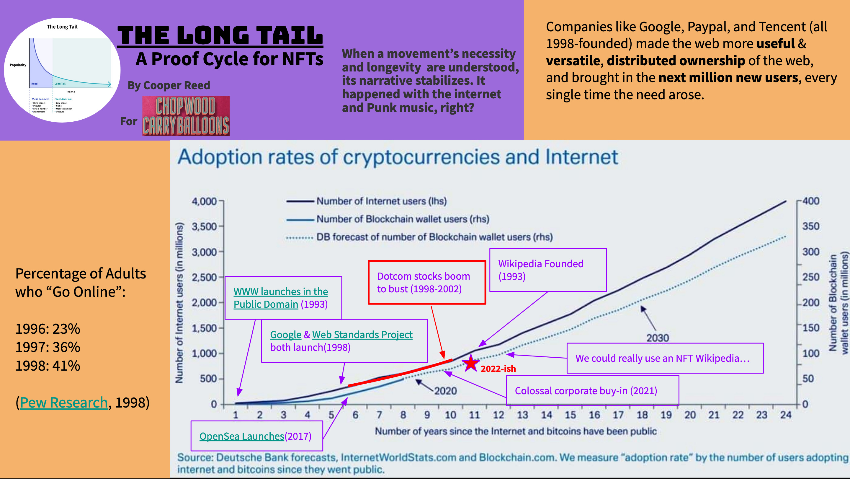 Along with the life-giving sunlight of attention, crypto and NFTs still need the flood of regulation that marked the late-90s internet explosion. We finally seem poised to get it. The US has started to sanction blockchain addresses associated with NFT theft, and prosecute public project founders who try to jump ship early. With luck, new legislation will provide better guidelines for what exactly an NFT promises, and better tools to ensure that those promises are upheld.